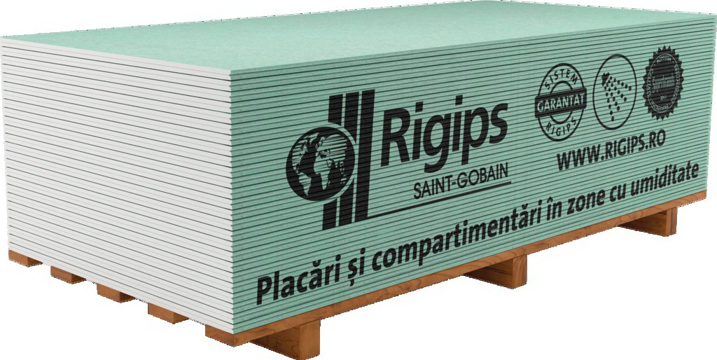 Гипсокартон Rigips гидро. Используются для отделки мансарды, кухни, закрытых балконов, оконных откосов, квартир / домов, расположенных в местности с повышенной влажностью (около рек, озер и т.д.). Допускается к использованию в помещениях с периодически (до 6 часов) повышенной относительной влажностью воздуха до 85%.