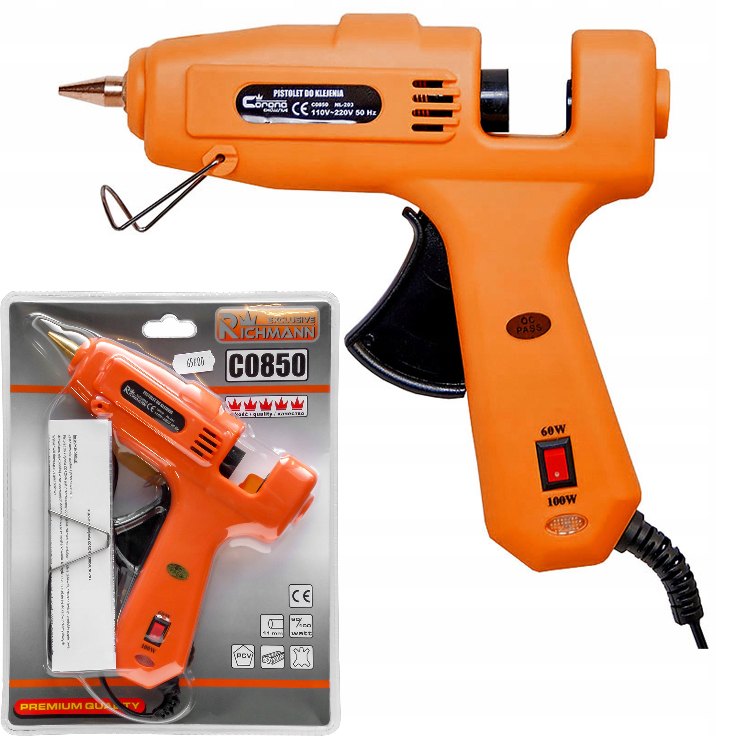 Горячий клеевой пистолет с латунным соплом Richmann (ранее Corona). Он имеет возможность устанавливать 2 уровня мощности 60 Вт и 100 Вт, кроме того, он имеет металлическую подставку для удобства эксплуатации, а также сигнальную лампу. Пистолет прогревается от 5 минут до 8 минут. Клейкие картриджи диаметром 11-11,2 мм. Большой удобный триггер облегчает точное дозирование. При использовании пистолета, если весь клей не израсходован сразу, растворенный клей не нужно сливать, его можно использовать для следующего использования. Использование клея другого диаметра не рекомендуется, так как это может повредить продукт.